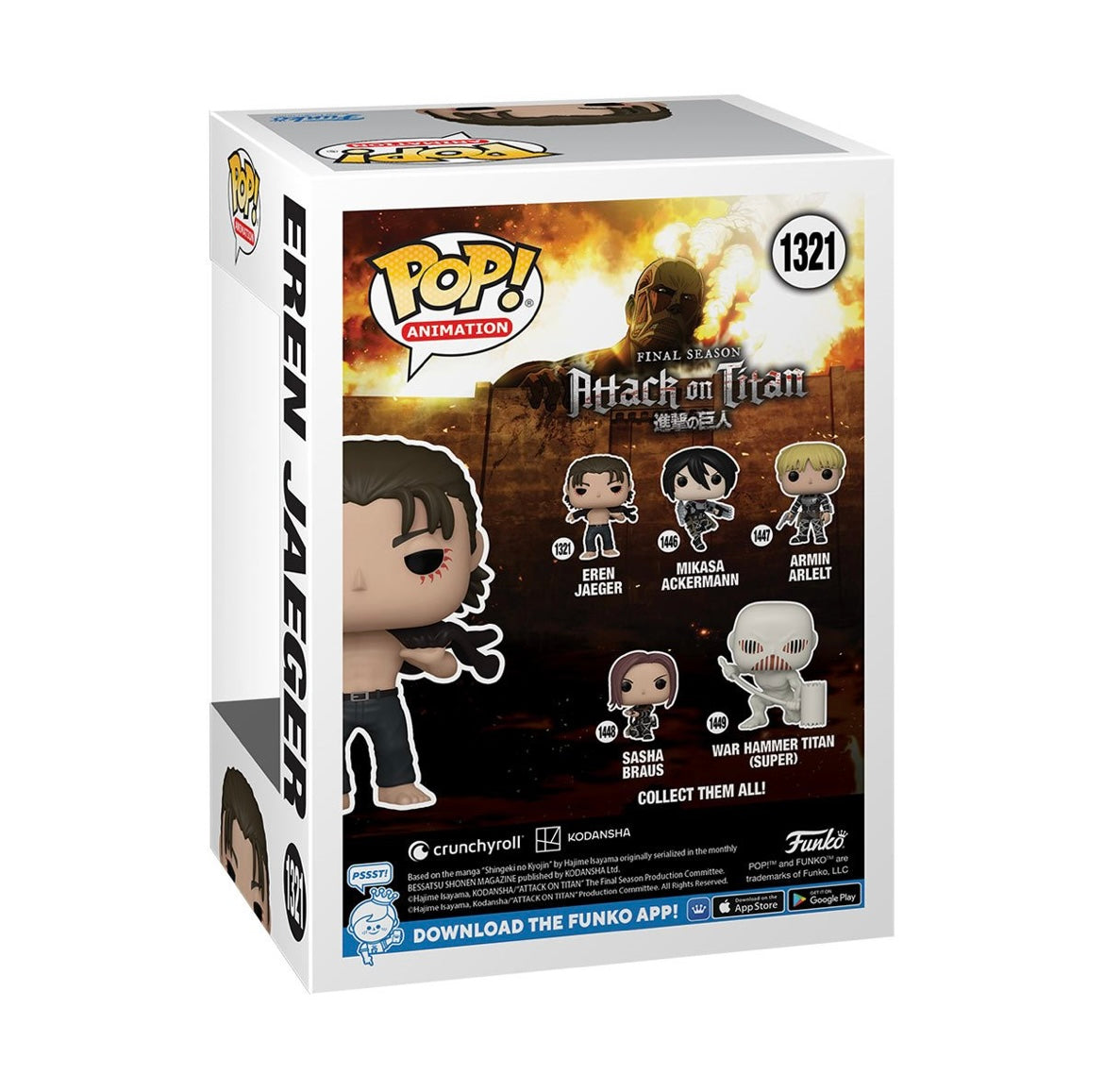 The fate of humanity hangs in the balance. Prepare your Attack on Titan collection for battle with Eren Jeager. Eren is dedicated to freeing the world from the reign of terror of the Titans. This Attack on Titan Eren Jeager Funko Pop! Vinyl Figure #1321 measures approximately 3 3/4-inches tall and comes packaged in a window display box. Ages 3 and up.